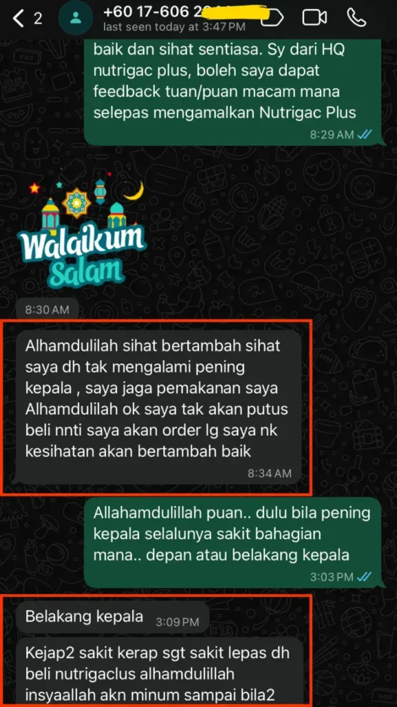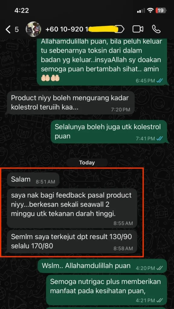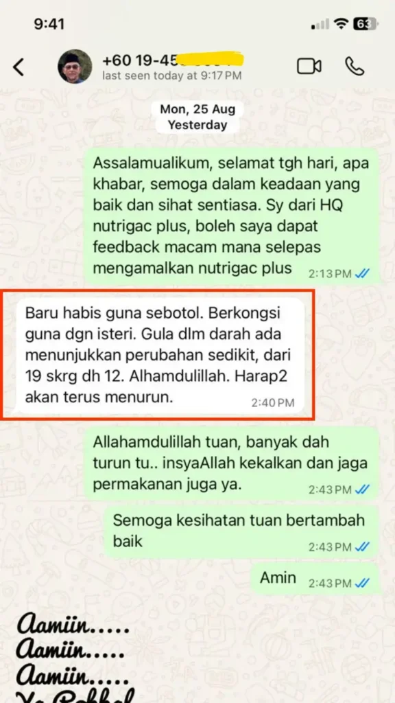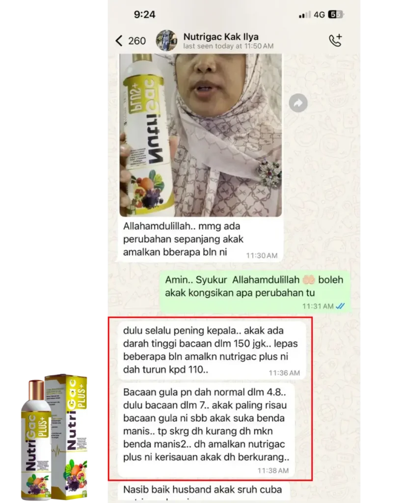 Lepas minum Nutrigac Plus+, bacaan makin stabil, kepala pun tak berat macam dulu, badan tak letih, kaki tangan pun dah ok.