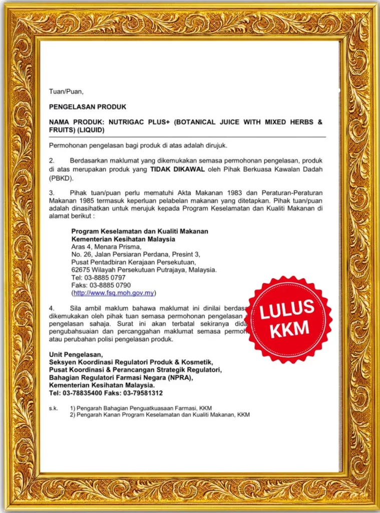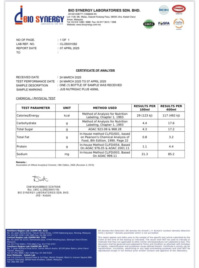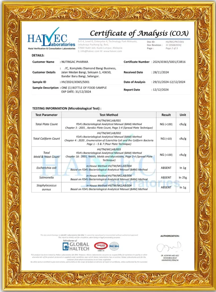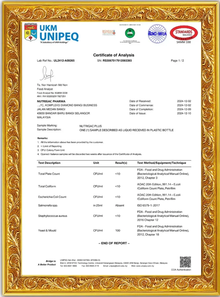 Nutrigac Plus+ diformulasikan di fasiliti bertaraf GMP dan melalui ujian makmal bertauliah bagi memastikan produk ini bebas bahan terlarang serta mematuhi piawaian keselamatan makanan KKM.